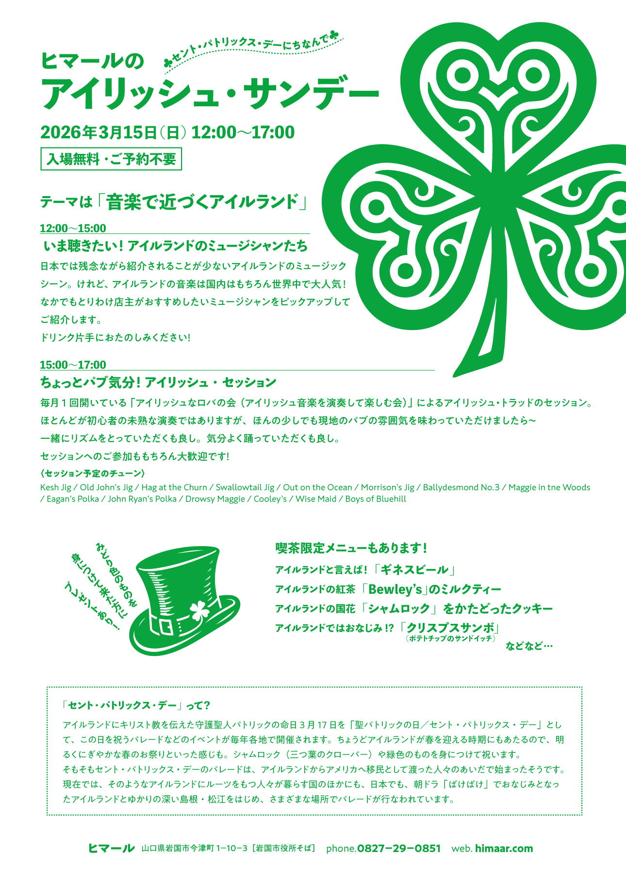 ヒマールの「アイリッシュ・サンデー」〜セント・パトリックス・デーにちなんで 2026年3月15日(日)12:00-17:00入場無料・ご予約不要 みどり色のものを身につけて来た方にプレゼントあり! テーマは「音楽で近づく […]